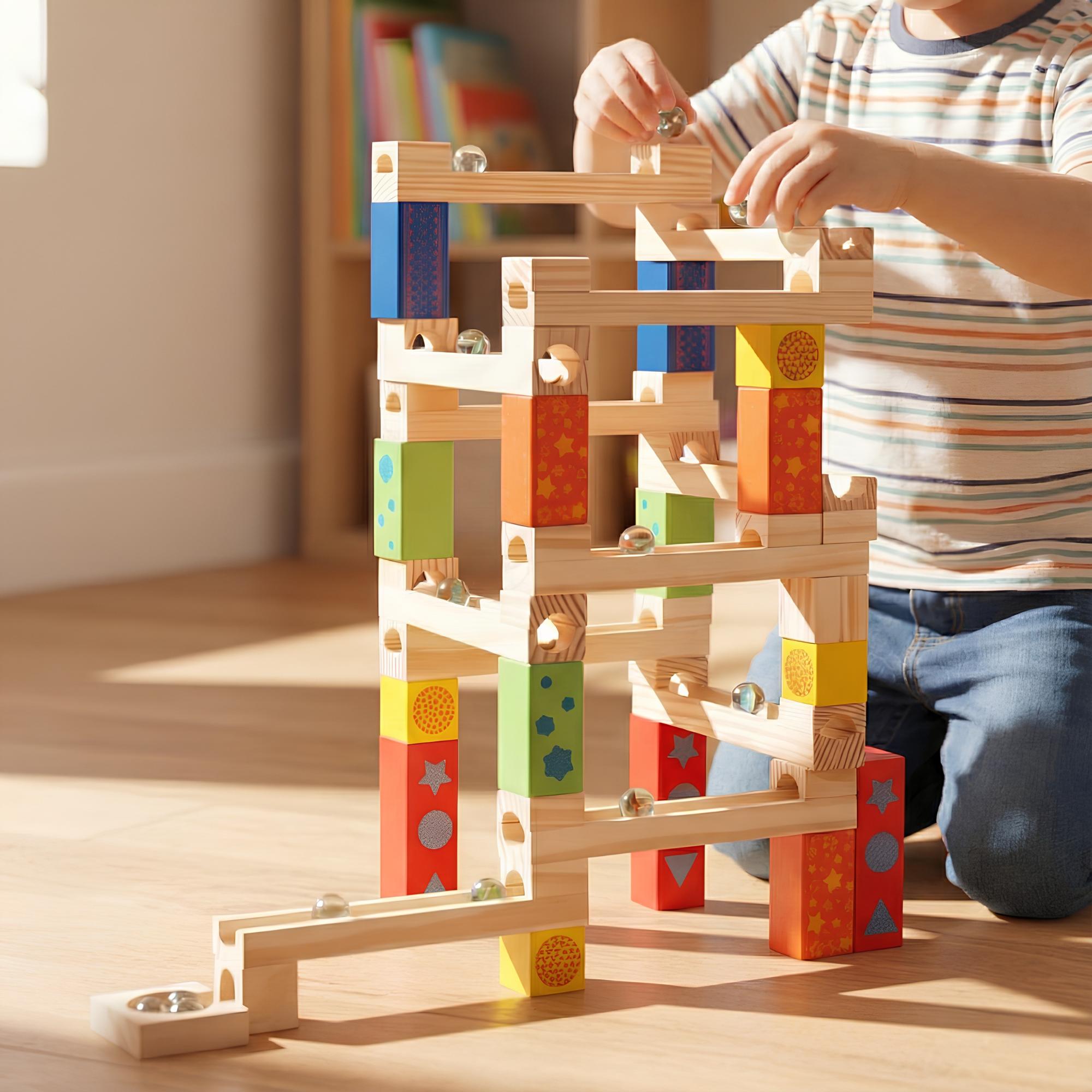 Diese Murmelbahn ist mehr als nur Spielzeug: Sie trainiert Feinmotorik beim präzisen Stapeln, schult logisches Denken beim Planen der Strecke und stärkt Geduld sowie Konzentration beim Testen und Optimieren.